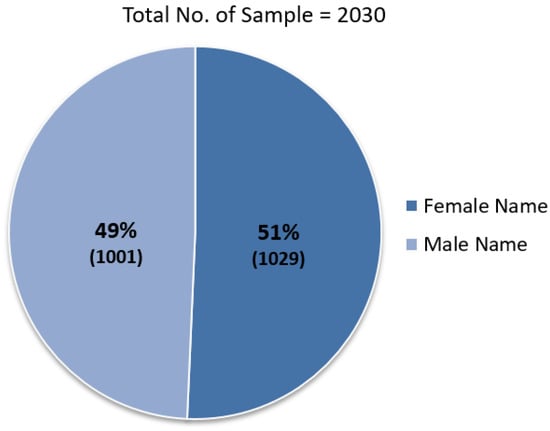We prepared a dataset for NLP tasks containing 2030 data samples of Bengali names and corresponding gender, both for females and males. In our dataset, there are 1029 names of the male gender and 1001 names of the female gender. The data samples are collected from different sources such as Wikipedia, baby name suggestion websites, etc. Mainly we collected the names and corresponding gender of famous poets, singers, athletes, baby names, and other well-known persons in Bangladesh. Our dataset is publicly available in the Hugging Face (https://huggingface.co/datasets/faruk/bengali-names-vs-gender?fbclid=IwAR1lT_GGiWRquGAJ4tefNSUqQj8OuCeTCiaOY1t_79SbLdq8Pv94W4Fto7Y, accessed on 26 December 2022). Full documentation and dataset specifications are also provided in the repository. The dataset in CSV format has two columns, namely Name and Gender. We classified the data into two categories, which are Male and Female. Each row has two attributes. The first one is name, and the second one is gender. The name attribute is in utf-8 encoding, and the gender attribute has been signified by 0 and 1; 0 is used for male, and 1 is for female. We did not consider only diminutive names, all kinds of names that means short, medium, and large size names are available in our dataset containing one, two, and three string, respectively. We did not perform augmentation to our collection by multiplying the number of names. This whole dataset was prepared and cleaned manually for our work. Our prepared dataset is graphically depicted in Figure 1.