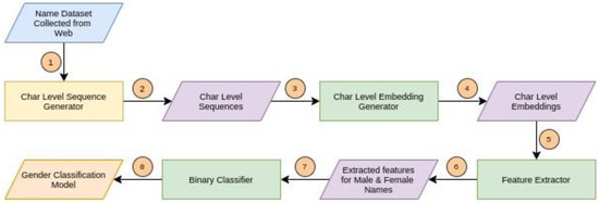 - Hu, Y.; Hu, C.; Tran, T.; Kasturi, T.; Joseph, E.; Gillingham, M. What’s in a name?—Gender classification of names with character based machine learning models. Data Min. Knowl. Discov. 2021, 35, 1537–1563. [Google Scholar] [CrossRef]