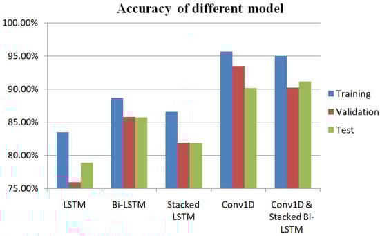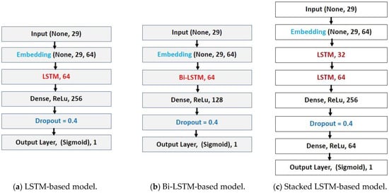 Long short-term memory (LSTM) networks are a kind of RNN that can learn long-term dependencies. It is essentially their default behavior to remember information for longer durations. LSTM holds promise for any sequential processing tasks, including language modeling, machine translation, handwriting recognition and generation, speech recognition, speech synthesis, etc. [28,29]. Several models based on LSTM, Bi-LSTM, and stacked LSTM are used in this paper.