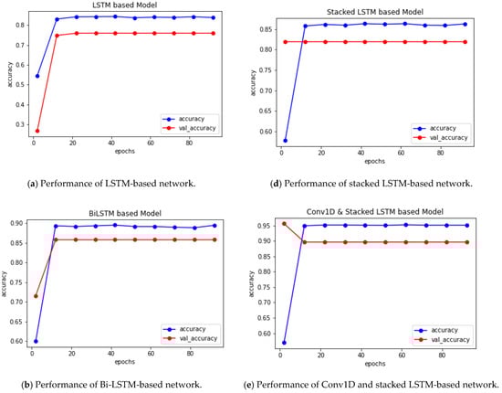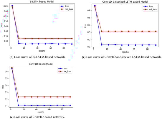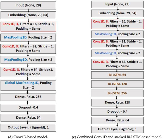 Five distinct deep neural networks based on LSTM, Bi-LSTM, and Conv1D were employed in total. Table 2 lists the technical specifications for each model. In addition, from Figure 3a through Figure 3e, each model’s layer visualization with data dimension is depicted.