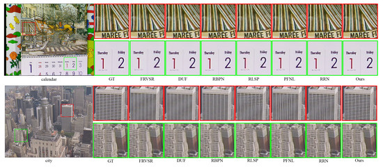 We select representative ‘calendar’ and ‘city’ video sequences from the Vid4 dataset to visually demonstrate our method. As shown in Figure 8, for the ‘calendar’ video sequence, we intercepted complex texture regions and character regions. Our method can completely restore the texture regions, and the outlines of character regions are also clearer than other methods. For the ‘city’ video sequence, our method obtains clear building textures and outlines compared with other methods, and the reconstruction results of other methods have blurred or unclear building outlines.