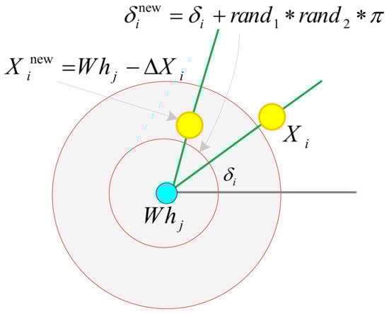 For ∆Xi, the furthest and nearest whirlpools are calculated according to their objective functions, i.e., the maximum and minimum values of Equation (30), and based on the equation Equations (34) and (35), given below and the value of ith particle’s angle concerning its whirlpool, jth, i.e., δi, variation of the particle’s position subject to a reduction in the objective function (describing the particle’s intelligence) is obtained: