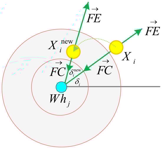 Every Wh applies a centripetal force and attracts and unifies the objects and particles (X), thus absorbing them into the sink. Hence, jth whirlpool located at Whj makes its position unified with that of the ith particle (Xi), i.e., Xi = Whj. Nonetheless, other whirlpools, according to their distances (Wh-Whj) and objective values (f ()), cause some deviations (∆Xi). Hence, the novel location of the ith particle is equal to Xinew = Whj − ∆Xi. Figure 1 illustrates the effects of these whirlpools on their set’s objects and particles.