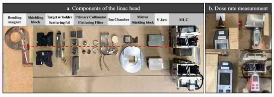 The head of the decommissioned Siemens linac was disassembled, and the components were classified following the treatment beam line (Figure 3a). After classifying the components, a survey meter (FH-40 G-L10, Thermo Scientific, Waltham, MA, USA) was used to measure the dose rate (Figure 3b). The environmental background dose rate was measured for 5 min. The components exhibiting dose rates greater than those of the background dose rates were primarily classified. The component dose rates were measured by holding a survey meter at distances from 0 to 5 cm, at 1 cm intervals. The dose rates were measured five times, and the average value was calculated. Further, the dose rates after five weeks post-decommissioning were measured.