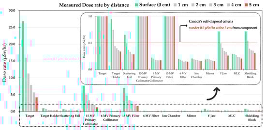 The dose rates for each component were measured on the day of disposal (Table 3) and after five weeks (Table 4). The dose rates were measured using a survey meter held at the surface at 5 cm distances with 1 cm intervals. As shown in Figure 4, the dose rate decreased logarithmically with increasing measurement distance. The components that exhibit 0.5 µSV/h or lower dose rates at 5 cm can be disposed of under Canadian law regarding the clearance level for disposal/recycling/reusing the activated medical accelerator components [17]. Following the Canadian guideline, the target, flattening filter, and primary collimator components were not allowed to be discarded on the day of disposal or for five weeks after.