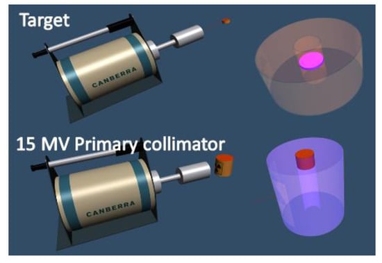 The gamma spectra of the Siemens linac components were acquired using the Canberra in situ HPGe detector. As shown in Figure 5, we simulated each component with a geometry that was as reflected the real dimension and shape as possible, considering the design drawing of the linac and the real measured dimensions of the part, and obtained the efficiency coefficient of each component.