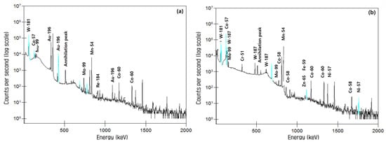 Two examples of the linac component spectrometry with HPGe detector: (a) Target, (b) 15 MV Primary Collimator. (Blue line: double peak).