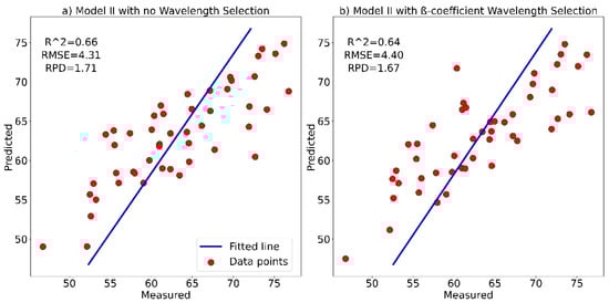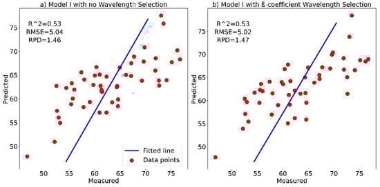 The selection of critical wavelengths was then carried out to see if this enhanced the models’ prediction accuracy. Using the β-coefficient variable selection approach, the number of wavelengths in the PLSR models effectively decreased to 79 spectral bands, i.e., the wavelengths from 732.53 to 969.63 nm were considered, as shown in Figure 5. In this case, the performance of only one model (i.e., 1D-SG preprocessing) was acceptable (RPD ≥ 1.4) when considering both no wavelength selection and β-coefficient wavelength selection. Moreover, the 1D-SG preprocessing methodology performance for the reduced wavelength range was superior to the PLSR models utilizing the full wavelength range (R2 = 0.66, RMSE = 4.31, and RPD ≥ 1.71). However, the selection of PLSR wavelengths through the β-coefficient method did not improve the accuracy of this model (R2 = 0.64, RMSE = 4.40, and RPD = 1.67) as shown in Figure 6. Nevertheless, Table 1 shows that both models showed better performance using the reduced wavelength range compared to the models utilizing all wavelengths. The VIP-based wavelength selection performance was comparatively low in both the cases when we considered full wavelength and when considering wavelengths between 732.53 and 969.63 nm. Based on Figure 5 and Figure 6, it can be seen that model II with optimum wavelength (732.53–969.63 nm) selection performed well compared to model I with full wavelength selection.