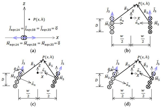 Figure 4, Figure 5 and Figure 6 shows the simplified magnetization surface current densities on the RDM, CDM, and VDM. Figure 4 shows a schematic of and in the xz plane by RDM at the crack tip. When the width of the crack is w, Equation (13) can be expressed as Equation (15): Here, the intensity of is assumed to be . w and θ represent the crack width and inclination angle, respectively. represents a specific position at the top of the magnetic domain model. D is the depth of the crack, and h is the lift-off. Equation (15) is a general expression expressing all of Figure 3b–d.