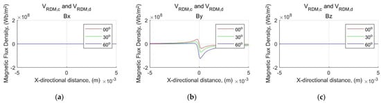 Distribution of magnetic flux densities with rotation domain model, and ; (a) x-, (b) y-, (c) z-directional component.