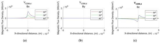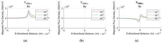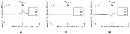 Distribution of magnetic flux densities with deformed vertical domain model, ; (a) x-, (b) y-, (c) z-directional component.