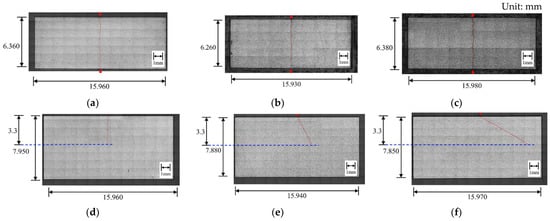 To investigate the quantitative trend of MFD based on the angle direction to the depth of cracks, Figure 17, Figure 18 and Figure 19 show the MFD distribution along a line passing through the center of the specimen (y = 5.1 mm) in Figure 15 and Figure 16. In each graph, is the value expressed by Equation (49). is the average value expressed by Equation (50). This variable was introduced to observe the correlation between the position of x and the crack inclination angle when . In addition, M, N, and r are the number of data points in the x-axis direction (M = 5000), number of data points in the y-axis direction (N = 2500), and spatial resolution (r = 0.004 mm), respectively. The thick solid line near the center of the longitudinal axis (x = 9.3–9.5 mm) is the central position of the crack observed under the microscope. The solid vertical lines at x = 1.4 mm and x = 15.9 mm indicate the positions of both corners of the specimen.