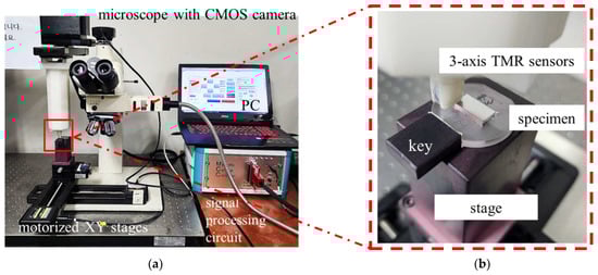 Figure 14a shows the experimental setup for measuring the MFD distribution on the upper part of each specimen using a 3-axis TMR sensor. A microscope and a 3-axis TMR sensor were installed on an optical board. Figure 14b shows an enlarged photograph of the red square in Figure 14a. The specimen was fixed with a key to reproduce the absolute positions of the optical images and TMR scanning before and after polishing. In addition, the specimen fixed by the key measured the MFD distribution with a spatial resolution of 4 μm and acquired an optical microscope image using a motorized XY stage. The MFD distribution was measured using a 3-axis TMR sensor (TMR2305, Multidimension Co., Paris, France). The sensitivity of each sensor was 25 mV/V/Oe, and the saturation magnetic field was ±10 Oe. As a result of amplification by 46 dB (200 times) by the signal processing circuit, 1 V is the output for an MFD of 0.2 G. The distance between the surface of the specimen and the sensor surface and the lift-off was maintained at approximately 0.2 mm.