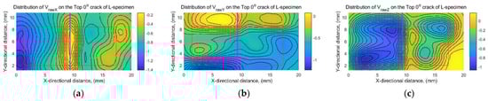 Figure 15 shows the raw output signal of the 3-axis TMR sensor in the x- (), y- (), and z- () directions. To map the distribution of the magnetic fields, the contour lines are added to all of the variations. In addition, the coordination of the specimen boundaries and the centerline line of the fatigue cracks are represented by the brown box and thick pink line on the vertical axis. The upper part of the rectangle is the surface side of the CT specimen, and the lower part is the center surface which is cut by EDM processes. To provide clear data for supporting the analysis, signal processing was conducted. The idea is to delete the background distribution of SMFD data by subtracting the raw data () from the background distribution (). The was gathered by measuring the distribution of SMFD in the air by removing the specimen from the setup. The signal processing processes can be described mathematically as follow: