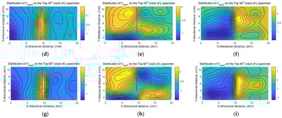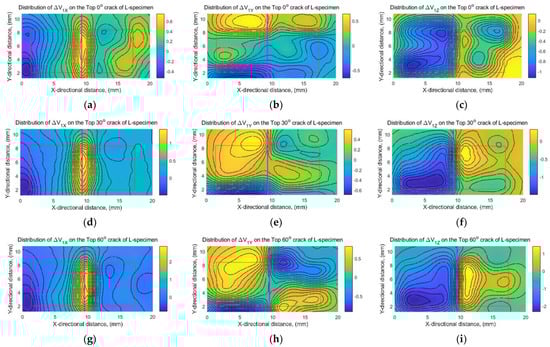 where, Figure 16 shows the distribution of Equation (46) and corresponds to the background signal in the x- (), y- (), and z- () directions. Interestingly, the overall trends in each case in Figure 15 and Figure 16 are very similar, indicating that the external magnetic field has negligible effect on the experimental values. As shown in Figure 16a,d,g, the X-component, , has a maximum value near the center of the crack, regardless of the depth angle of the crack, and has a symmetrical shape. As shown in Figure 16c,f,i, the Z-component, , represents the distribution of the different signs on the left and right sides around the crack. This phenomenon can be explained by the VDM in Figure 9 and Figure 10. Moreover, as shown in Figure 16b,e,h, the Y-component, , does not differ significantly along the center line of the crack, indicating that the VDM model is valid.