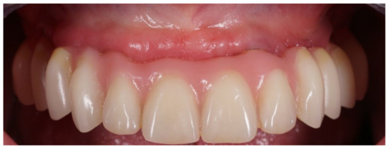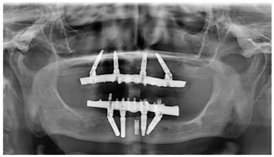 From 2010 to 2015, implants were positioned free-hand using the radiographic templates to prepare implant recipient sites; from 2016 to the conclusion of the report, fully computer-guided surgery with static templates was used to place the implants. Platform-switched implants with round apexes (Bone Level Implant, Straumann, Straumann AG, Basel, Switzerland) or tapered apexes (Bone Level Tapered Implant, Straumann) with a narrow neck diameter of 3.3 mm were used in the treated patients. A specific drill set was used to prepare each implant recipient site (Surgical Kit, Straumann). The sequence of the drills was carefully respected in order to underprepare the implant recipient site, enhancing primary stability. The first drill was a needle drill that had to create a hole in the cortical zone. Then, the pilot drill (2.2 Ø mm) was used to create a pathway in the hole made by the needle drill. These two drills were used under copious irrigation at 800 rpm. The last drill was the 2.8 Ø mm drill, which followed the pilot drill pathway. The drill was used without irrigation at 40 rpm in order to recover bone chips along the drill. Then, the profile drill (3.3 Ø mm) was used only in the crestal zone to reduce stress on the cortical zone during implant positioning. The flaps were limited to the implant recipient zone and were not overextended in order to reduce the invasiveness. The insertion torque was confirmed with a torque wrench (Straumann AG). After implant placement, angulated or straight screw-retained abutments (SRA, Straumann) were positioned to enhance the parallelism between the tilted and vertical implants with titanium copings screwed onto them. The SRAs could correct the emergence profile from 0° to 30° with different gingival heights to create an appropriate transmucosal tunnel and an axial support for the occlusal load. Sutures were used if necessary and were made by polyglycolic acid (PGA). Chlorhexidine (0.1%) was recommended for patients twice daily for one week for plaque control. For pain control, the patients were prescribed analgesics. The sutures were removed 14 days after surgery. The interim prostheses based on the prosthetic plans were milled from blocks of polymethyl methacrylate (PMMA, dima Mill temp, Kulzer) and merged with a self-curing resin (Enamel Plus, Micerium) to the titanium copings. The correct position of the interim prosthesis was determined by occlusal contacts with the opposite dentition. The interim prostheses had no cantilevers and were screwed to 15 Ncm onto the SRAs (Figure 4 and Figure 5).