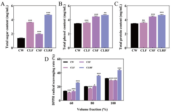 Determining the active substance content and DPPH radical scavenging capacity of three different Coix seed fermentation broths: (A) Total sugar, (B) Total phenol, (C) Total protein and (D) DPPH radical scavenging capacity of three different volume fractions of Coix seed fermentation broth. CW: Coix seed water extract; CLF: Coix seed Lactobacillus bulgaricus fermentation broth; CSF: Coix seed Saccharomyces cerevisiae fermentation broth; CLRF: Coix seed Lactobacillus reuteri fermentation broth. Each value is expressed as mean ± SD (n = 3). The difference analysis between other experimental groups and the CW group is indicated by “*” (ns > 0.05, *: p < 0.05, **: p < 0.01, ***: p < 0.001, compared with CW group).