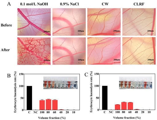 Vascular-rich eggs were selected for the experiment, and the shells were carefully peeled from the air chambers with forceps to expose the surface of the CAM, washed with NaCl solution, dropped into 300 μL of positive control, negative control and sample, and observed for 3 min. Morphological observations and scores were made for the positive control (0.1 mol/L sodium hydroxide solution), negative control (0.9% NaCl solution), CW and CLRF before and after the addition of CAM samples. The results of the scoring are shown in Table 4, with no irritation at either CLRF or CW. It is clear from Figure 2A that the CAM vascular response of the positive control was accompanied by significant haemorrhage and vascular lysis, while the CAM vascular responses of CW and CLRF were consistent with the negative control in that there was no haemorrhage, vascular coagulation or vascular lysis, and therefore neither CW nor CLRF caused irritation.