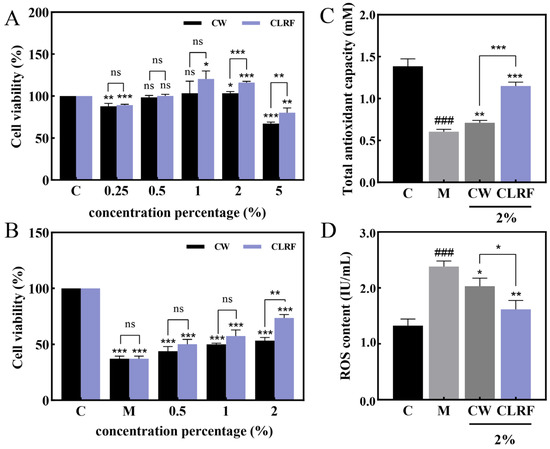 Cell viability and protection against a model of H2O2 damage were explored by CCK8 assays with CLRF and CW. HSF cells from the same colony were used for this experiment. HSF (China Institute of Inspection and Quarantine, Beijing, China) were cultured in a flask containing DMEM medium (Gibco, Waltham, MA, USA) supplemented with 10% fetal bovine serum (Gibco, Waltham, MA, USA) and 1% penicillin-streptomycin (Thermo Fisher Scientific Co., Ltd., Shanghai, China). The cells were stored in a 37 °C HeraCell CO2 incubator (Thermo Fisher Scientific Co., Ltd., Waltham, MA, USA) containing 5% CO2 and cultured for 2 d.