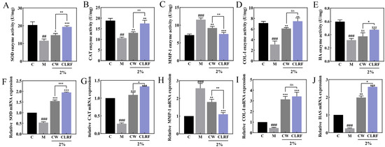 This article further tested the effects of CLRF and CW on the enzymatic activities of intracellular antioxidant and protein hydrolases, collagen, matrix metalloproteinases and hyaluronic acid content, and analysed their mRNA expression. As shown in Figure 4, the model group that underwent H2O2-induced damage showed that the enzymatic activity and mRNA expression of the antioxidant enzymes SOD and CAT were reduced by nearly half compared to the control group. Compared to the model group, both CLRF and CW significantly increased the enzymatic activities and mRNA expression of SOD and CAT at 2% volume fraction, and the effects of CLRF were more significant. Cells treated with CLRF and CW showed a significant increase in the activity of protein hydrolases COL-I and HA, and a more than threefold increase in mRNA expression. In addition, the enzyme activity of MMP-1 was significantly reduced, and the mRNA expression level of CLRF-treated cells was close to that of the uninjured cell model.