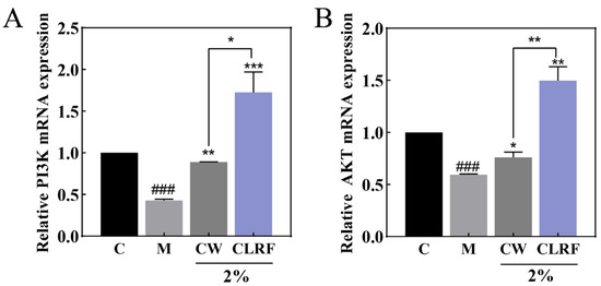 PI3K/AKT is involved in regulating cell proliferation, apoptosis and other physiological activities, and is a critical pathway associated with oxidative stress [26]. As shown in Figure 5, the expression of the PI3K/AKT gene was significantly decreased in HSF after H2O2 treatment compared to the control group. Compared to the model group, the CLRF and CW were able to upregulate the expression of PI3K/AKT signaling pathway. In addition, the up-regulation of PI3K/AKT gene expression by CLRF was significantly higher than that by CW.