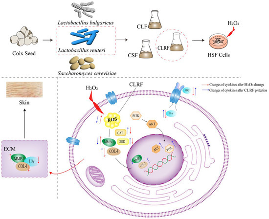 A schematic diagram showing the regulatory mechanisms of the protective effects of CLRF on skin fibroblasts damaged by H2O2. Coix seeds were fermented by three bacteria and finally CLRF was selected for cellular and molecular level investigation. After the protective treatment with CLRF, the HSF cells activated the expression of PI3K/AKT signaling pathway, inhibited the accumulation of ROS in the cells, enhanced the cellular antioxidant system, increased the content of COL-I and HA in the cytoplasmic matrix and decreased the content of MMP-1, protected the skin structure and slowed down the damage of H2O2 on the HSF cells.