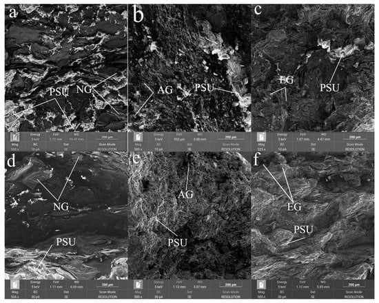 SEM micrographs of: polysulfone (PSU) + 30 wt.% NG (a); PSU + 30 wt.% AG (b); PSU + 30 wt.% EG (c); PSU + 70 wt.% NG (d); PSU + 70 wt.% AG (e); PSU + 70 wt.% EG (f) ×500.