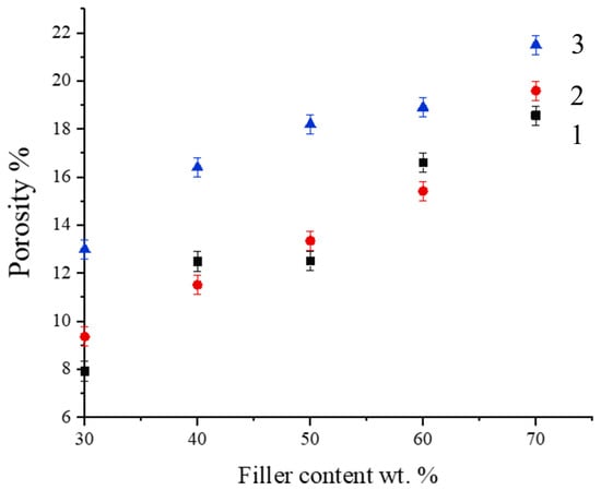 The additivity rule was used to calculate the porosity based on the real density of the polymer (1.234 g/cm3) and the ideal density of a single graphite crystal (2.27 g/cm3). The resulting samples have defects inside the graphite particles as well as porosity along the polymer-filler interfaces, since the true density of the graphite particles is always lower than the density of a single crystal. As a result, a rise in overall porosity is connected with an increase in the amount of the material’s fillers, which have their own nanosized porosity at a level of 12–15%.