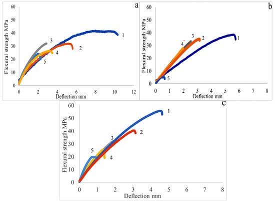 Flexural test curves of PSU based composites filled with 30 (1), 40 (2), 50 (3), 60 (4) and 70 (5) wt.% of NG (a), AG (b) and EG (c).