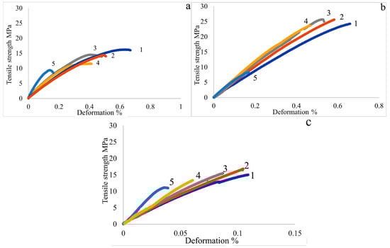 Tensile test curves of PSU based composites filled with 30 (1), 40 (2), 50 (3), 60 (4) and 70 (5) wt.% of NG (a), AG (b) and EG (c).