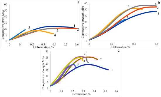 The compression test of PSU based composites filled with 30 (1), 40 (2), 50 (3), 60 (4) and 70 (5) wt.% of NG (a), AG (b) and EG (c).