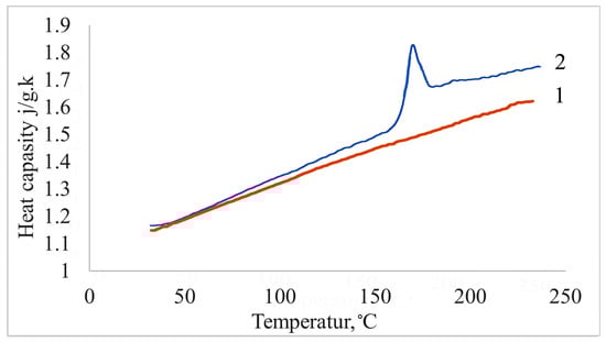 Specific heat capacity versus temperature for Gr (1) and PSU (2).