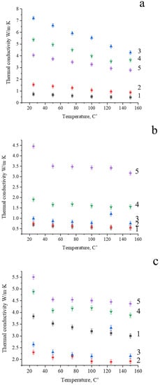 Thermal conductivity temperature dependencies of PSU-based composites filled with 0 (1), 30 (2), 40 (3), 50 (4), 60 (5) and 70 (6) wt.% of NG (a), AG (b) and EG (c).