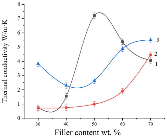 Thermal conductivity as function of filler content of PSU-based composite filled with NG (1); AG (2) and EG (3) at 25 °C.