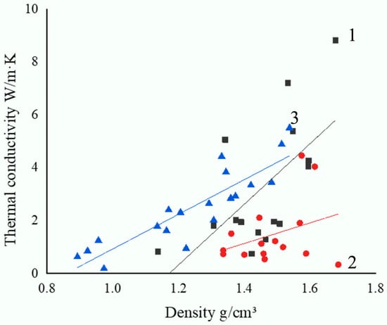 Thermal conductivity asa function of density of PSU-based composite filled with NG (1); AG (2) and EG (3) at 25 °C.