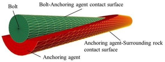 A schematic diagram of the fully grouted bolt on an anchored structural surface is shown in Figure 1. A cube of 500 mm × 500 mm × 500 mm (length × width × height) was taken as the surrounding rock near the structural surface, divided into two parts of the same size, and the structural surface was set up between the upper and lower parts using the interface element. The bolt was arranged at the center of the model with a length of 500 mm and diameter of 22 mm, and the diameter of the borehole was 42 mm, which was filled with an anchoring agent. The contact surfaces between the bolt and anchoring agent and the anchoring agent and surrounding rock were set using the interface element, and a schematic diagram of the contact surfaces of the bolt system is shown in Figure 2.