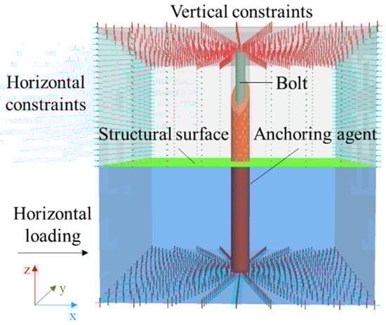 Constraints in the z-direction were applied to the upper and lower sides of the model. Constraints in the x-direction were applied to the left and right sides of the upper rock mass. Constraints in the y-direction were applied to the front and rear sides, and the lower rock mass was loaded along the x-direction with a loading rate of 1 × 10−7 m/step. The boundary conditions and loading mode of the model are shown in Figure 3. The parameters related to the extent of the anchoring agent damage and bolt deformation were monitored during the dislocation of the structural surface.