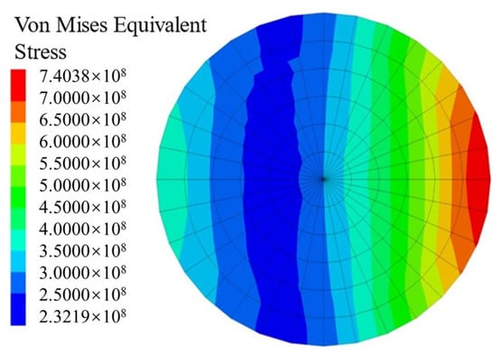 With the increase in the shear displacement of the structural surface, the stress on the bolt is the greatest near the structural surface. Taking the structural surface of sandstone as an example, the Von Mises stress of the cross-section at the location of the structural surface on the bolt when it yielded is shown in Figure 4, which shows that the stress distribution on the cross-section was not uniform. The Von Mises stress at each node on the cross-section was determined and averaged. When the average Von Mises stress reached 400 MPa, the bolt was considered to have yielded.