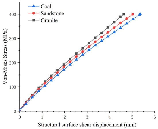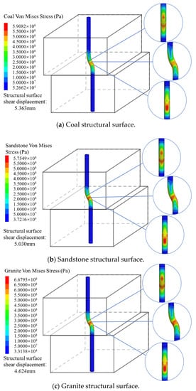 Figure 5 shows the average Von Mises stress of the bolt versus the shear displacement at the bolt–structural surface intersection. When the bolt yielded in the anchored structural surface, the shear displacements of the structural surfaces of the coal, sandstone, and granite were 5.363 mm, 5.030 mm, and 4.624 mm, respectively. With the structural surface dislocation, it can be seen that the trends of the Von Mises stress of the bolt in the different lithologies of structural surfaces were roughly the same. The stronger the structural surface lithology, the larger the increase in the Von Mises stress per unit of shear displacement.