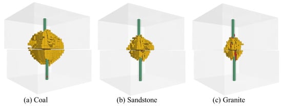 The calculated axial stresses of the bolt at the structural faces of the coal, sandstone, and granite rock when the bolt yielded were 212.76 MPa, 196.54 Mpa, and 182.09 Mpa, respectively, and the axial stresses obtained from numerical simulations were 221.36 MPa, 201.78 MPa, and 188.69 MPa, respectively. The axial stress distribution along the length of the bolt is shown in Figure 14, which shows that the calculated results of the axial stress of the bolt are in general agreement with the numerical simulation results. The bolt deformation areas in the simulation results are slightly larger than the bolt deformation area in the numerical calculation. This is because when counting the unit volume of the anchoring agent plastic zone, some parts of the anchoring agent are not fully damaged along the bolt circumference, while when calculating the anchoring agent damage range, the anchoring agent is considered to be fully damaged along the bolt circumference, thus making the calculated anchoring agent damage range slightly smaller than the anchoring agent damage range obtained from the numerical simulation. Nevertheless, the calculated distribution of the axial stresses of the bolt describes, with some accuracy, the distribution of the axial stresses at the local locations of the bolt during the shear displacement of the structural surface.