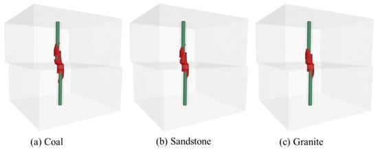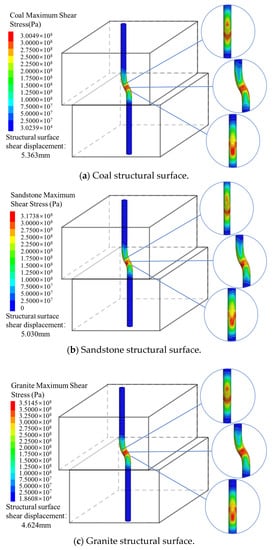 The Von Mises stress intensity of the bolt when it yielded in the coal, sandstone, and granite structural surfaces is shown in Figure 9. The maximum shear stress is shown in Figure 10, and the axial stress is shown in Figure 11. It can be seen that the areas where the bolt deformation occurred were mainly distributed near the structural surfaces. From the simulation results, when the bolt yielded, the lengths of the bolt deformation areas in the structural surfaces of the coal, sandstone, and granite were 12.3193 cm, 11.9166 cm, and 11.4171 cm, respectively, which are approximately the same as the damage ranges of the anchoring agents. The deformation areas of the bolt were mainly concentrated near the structural surfaces, and the areas of the bolt far away from the structural surfaces were almost not deformed. The local deformation of the bolt was roughly “S” shaped.