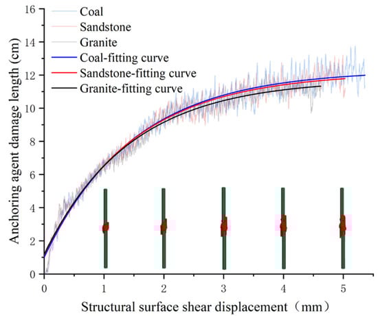 The shear displacements of the structural surface when the bolt yielded in the coal, sandstone, and granite structural surfaces were 5.363 mm, 5.030 mm, and 4.624 mm, respectively, and the corresponding damage ranges of the anchoring agent were 12.2132 cm, 11.9077 cm, and 11.3664 cm. It can be seen that the variation laws of the damage range curves of the anchoring agents of different rock mass structural surfaces were roughly the same. With the dislocation of the structural surface, the damage range of the anchoring agent first increased rapidly and then tended to level off. Under the same shear displacements of the structural surfaces, the lithologies of the structural surface rocks were stronger, and the extent of the anchoring agent damage was smaller.