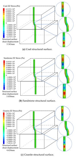The stress state of each part of the bolt was monitored, and the stress distribution diagrams of the bolt are shown in Figure 10 and Figure 11. It can be seen that the shear stress on the bolt was mainly concentrated near the structural surface and the angle between the maximum shear stress and the structural surface is approximately 45°. The axial stress of the bolt shows an approximately origin-symmetric stress distribution on both sides of the structural surface, where the tensile stress is positive, and the compressive stress is negative. With the shear displacement of the structural surface, the bolt deformation appears as a tensile stress zone and a compressive stress zone. The simulation results show that when the bolt yielded, the average axial stresses on the bolt near the structural surfaces of the coal, sandstone, and granite were 221.36 MPa, 201.78 MPa, and 188.69 MPa, respectively, and the average shear stresses were 114.01 MPa, 194.56 MPa, and 230.63 MPa. It was found that the weaker the lithology of the structural surface rock was, the larger the deformation area of the bolt, the larger the tensile stress of the bolt, and the smaller the corresponding shear stress.
