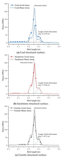 The distributions of the average axial stress and average shear stress along the length of the bolt when it yielded in the structural surfaces of coal, sandstone, and granite rock are shown in Figure 12. It can be seen that the areas where deformation occurred on the bolt were mainly concentrated near the structural surface, and the maximum value of stress was at the position to the right of the structural surface. This mild asymmetry was due to the fact that the loading was applied to the rock below the structural surface, which made the deformation of the bolt at the slightly lower position near the structural surface somewhat larger. When the bolt yielded, the contribution of the axial stress and shear stress to the yielding varied among the different lithologies. According to Equation (2), the contribution of the axial stress was 30.63% when the bolt yielded in the coal structural surface, 25.25% when the bolt yielded in the sandstone structural surface, and 22.25% when the bolt yielded in the granite structural surface. At this time, the ratios of axial stress to shear stress at the structural surface of the bolt were 1.94, 1.04, and 0.82, respectively, which shows that the weaker the lithology of the structural face was, the higher the axial stress generated by tensile deformation, and the lower the shear stress generated by the shear action of the surrounding rock.