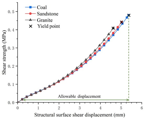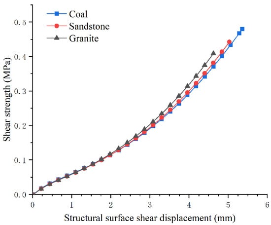where is the cohesive force on the structural surface, 0.1 MPa; is the internal friction angle on the structural surface, 20°; is the normal stress on the structural surface when no bolt is applied, 3 MPa. The shear strength of the structural surface itself was calculated to be 1.19 MPa. With the dislocation of the structural surface, the ratios of the shear strengths of the structural surfaces enhanced by the bolt in the coal, sandstone, and granite structural surfaces to the shear strength of the structural surface itself at the unit shear displacement were 24.21%, 25.69%, and 27.79%, respectively. When the bolt yielded, the ratios of the total shear strengths of the structural surfaces enhanced by the bolt in the coal, sandstone, and granite structural faces to the shear strength of the structural surface itself were 129.84%, 129.21%, and 128.48%, respectively. It can be seen that the shear strength enhancement of the anchored structural surface caused by the structural surface dislocation played a considerable role in hindering the structural surface dislocation.
