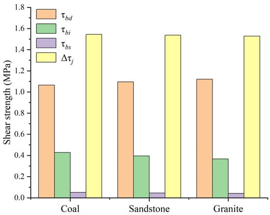 In addition to the bolt tensile action that can improve the shear strength of the structural surface in the case of dislocation, there is also the pinning action of the bolt that hinders the shear movement of the surrounding rock, which can also enhance the shear strength of the structural surface. When the bolt yielded with the dislocation of the structural surface, the tensile effect of the bolt and the pinning effect increased the shear strength of the structural surface, as listed in Table 6, and the corresponding bar graph is shown in Figure 16. The shear strengths of the enhanced structural surfaces were 1.5451 MPa, 1.5377 MPa, and 1.5289 MPa when the bolt yielded in the coal, sandstone, and granite structural surfaces, respectively. It can be seen that the magnitudes of the total structural face shear strength enhanced when the bolts yielded in different structural surfaces of the rock mass were approximately equal. In the coal, sandstone, and granite structural surfaces, the shear strength of the enhanced structural surfaces by the bolt pin action accounted for 68.91%, 71.27%, and 73.33% of the total enhanced shear strength, respectively, and the shear strength of the enhanced structural surfaces by the anchor tensile action accounted for 31.09%, 28.73%, and 26.67% of the total enhanced shear strength, respectively. Therefore, in the case of the dislocation of the structural surface, both the pinning and tensile action of the bolt can improve the shear strength of the structural surface, and the pinning action of the bolt plays the main role. With the weakening of the lithology of the surrounding rock containing the structural surface, the contribution of the pinning action to the shear strength of the enhanced structural surface decreased, and the contribution of the tensile action to the shear strength of the enhanced structural surface increased.