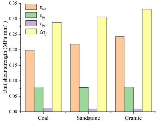 When the bolt yielded with the dislocation of the structural surface, the tensile effect of the bolt and the pinning effect under the unit shear displacement increased the shear strength of the structural surface, as listed in Table 7, and the corresponding bar graph is shown in Figure 17. The shear strengths of the enhanced structural surfaces at the unit shear displacement were 0.2881 MPa, 0.3057 MPa, and 0.3307 MPa when the bold yielded in the coal, sandstone, and granite structural surfaces, respectively. It can be seen that the better the lithology of the structural surface rock, the greater the shear strength of the structural surface enhanced by the bolt at the unit shear displacement. In the coal, sandstone, and granite structural surfaces, the shear strengths of the enhanced structural surfaces by the bolt pin action under unit shear displacement accounted for 68.90%, 71.87%, and 73.33% of the total enhanced shear strength, respectively, and the shear strengths of the enhanced structural surfaces by the bolt tensile action accounted for 31.10%, 28.13%, and 26.67% of the total enhanced shear strength, respectively. Therefore, the bolt pin action still plays a dominant role in enhancing the shear strength of the structural surface at unit shear displacement.