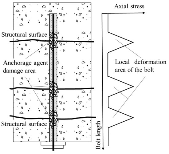 For the fully grouted bolt, it was generally impossible to apply a preload, but when the bolt passed through multiple structural surfaces (Figure 18), with the deformation of the surrounding rock, each structural surface underwent different degrees of dislocation, resulting in local damage and destruction of the anchoring agent near the structural surface. Thus, the bolt in this range was no longer restrained by the anchoring agent and approximately entered the free state, at which time the bolt was passively in tensile–shear stress due to the dislocation of the structural surface. The reaction of the passive tensile–shear stress of the bolt enhanced the shear strengths of the structural surfaces, thus preventing the structural surfaces from continuing to dislocate and bringing the anchored rock to a stable state. This is a passive reinforcement mechanism of the shear strength of the structural surface under the dislocation of the anchored structural surface.