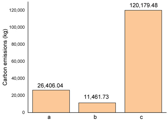 Figure 1 compares the carbon emission levels of each component of the logistics and transportation stage. In Figure 1, “a” represents the transportation of building materials, “b” represents the loading and unloading of prefabricated components, and “c” represents the off-site transportation of the prefabricated components. The off-site transportation of the prefabricated components was plotted at a full-load rate of 70%.