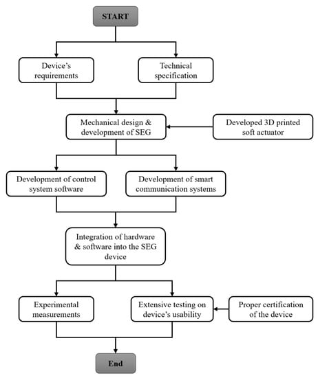 In particular, the current paper consists of five sub-sections, of which Section 2.1 lists the requirements coupled with the technical specifications of an SEG device. In Section 2.2, the employed actuator is presented with its motion mechanism and the measured experimental capabilities. Furthermore, the strategies of the developed software for this device are described in Section 2.3. In Section 3.1, the final design and assembly of the developed SEG are depicted with both the physical device and the software application. Finally, Section 3.2 summarizes the most important results from measurements of the device function coupled with the certifications and the extensive testing that has been conducted by healthy participants (control group) and patients. Figure 1 portrays the flowchart of the SEG’s device development coupled with a detailed description of each followed procedure.